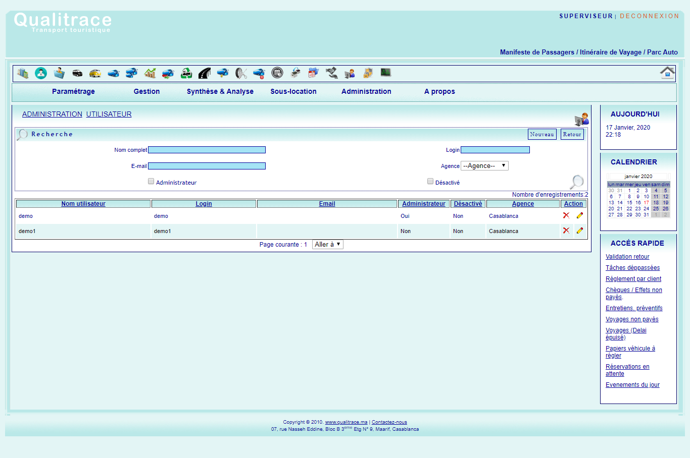 Gestion des accès pour les utilisateurs complètement personnalisable (Ajout, Modification, Suppression, desactivation , temps de travail, droit accès au menu ... etc.)